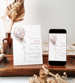 Soft, sweet, and designed to make her day feel extra special—this baby shower invitation features a whimsical pink balloon paired with elegant greenery for a look that feels both dreamy and polished. Whether you're celebrating at brunch or in the backyard, this invitation sets the tone with charm and grace.
