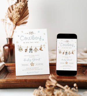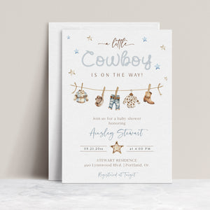 Round up your guests with this adorable cowboy baby shower invitation—designed with watercolor stars, soft western tones, and a hanging clothesline of cowboy gear. It’s sweet, simple, and fully editable by you. Just click the link after purchase to open it in your browser using Corjl—no software, no stress.