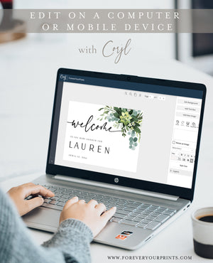Welcome your guests with timeless charm and a fresh touch of nature. This greenery baby shower welcome sign features soft watercolor eucalyptus and succulents, designed to set the tone for a warm, heartfelt celebration. Personalize your sign effortlessly using Corjl’s intuitive online editor—no software required. Just edit, download, and print for a polished, personal touch that beautifully greets every guest.