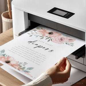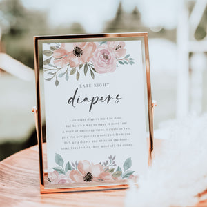 Add a heartwarming and humorous touch to your baby shower with this editable “Late Night Diapers” sign. Surrounded by soft dusty rose florals and featuring a lighthearted poem, this sign invites guests to write encouraging or funny notes on diapers to lift the spirits of new parents during midnight changes. Easy to personalize and instantly printable, it’s a beautiful and interactive detail that brings joy long after the shower ends.