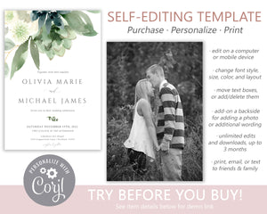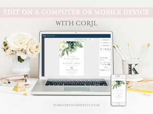 This instant download is easy to customize and print from home, saving you time and money without sacrificing style. Share your big day with your loved ones with this professional-looking invite, created and customized from the comfort of your home computer with Corjl. Access your self-editable template(s) within minutes of placing your order and create your own invitations using CORJL - a fully customizable template editor that allows you to personalize your design directly in your web browser.